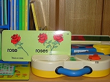 今週一週間でやったこと息子k-bo君(小五)・・・・・TACカード47枚をPLAYMATEに通して、単語とセンテンスを言う。通さずにカードを見て単語とセンテンスを言う。ゲーム(DS)で遊ぶ時間がかかっているので、結構まじめにやる。このカードに録音機能があり、小さい頃のかわいい声が残っている。上書きせずに残しておくことに・・・。幼い声で実に流暢な英語をしゃべっている。あの頃からサボらず、根気よく続けていば・・・と思う・・。This is a rose.These are roses.単数形、複数形の言い方も文法など関係なく、言っておぼえる。このシステム、母国語方式と言って英語を英語のまま理解させるシステム。This is~もThese are~も絵を見て、耳で聞いておぼえる。もう小五になってしまった子にこの方法でよいのか疑問だけれど、このシステムを信じてやってみよう。中学に上がるまでの一年間だけでも。今週の47枚がんばった!!娘k-joさん(中一)・・・・・k-boがカードを通しているのを聞いていたこと。あとは、進研ゼミから英語の復習CD-ROMが届いたので、それをやる。疑問詞のある疑問文、過去の分、現在進行形の文8日間のプログラムを一日で終わらせてしまった。英作文の練習になり、とてもよくできている教材だと私は感心しながら横で見ていた。物語形式になっていて、先に進みたくなるように出来ている。結局ディズニー・・・の教材はk-joさんはしなかった@@第一週目はこんな感じでした。ブログに書くのだから、何かさせなければと言う私の意識も大事だと思った。★★★★★DWEシングアロングセット↑売りに出してしまう方も多いのね(T T)今まで使ってみて(あまりまじめではなかったけれど)歌で英語を覚えるのが一番いいと感じています。ポプラポケット文庫のシリーズおすすめです。小学生から中学生向けがあります。