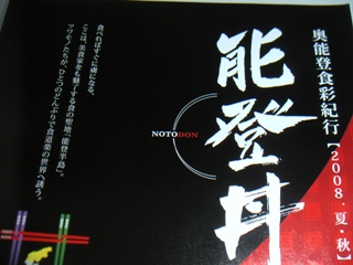 ドライブ中、あちこちでこの旗を掲げたレストランやお寿司屋さん、ホテルなどを見かけましたお昼に注文してみると、白身の山かけ丼と称する、ヘルシーでさっぱりと頂ける美味しい丼が出てきましたご主人に聞いてみると、奥能登食彩紀行というプロジェクトで、食材からお米、器に至るまですべて地元の物を使った丼メニューを各店舗ごとに考案して、認定を受けたお店がこうして能登丼を提供しているのだそうです。パンフレットを頂いてきましたが、どれもみんな美味しそうなものばかりこれを持って、丼めぐりも楽しいかも大満足で東京に戻りました