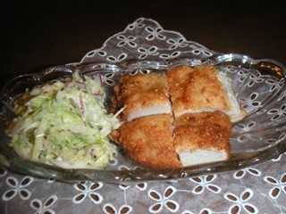クリスマスになるとケンタッキーの前はものすごい人だかり・・・予約の人達がクリスマスパックを受け取りにきているんですねでもね、自分で作るフライドチキンもいいものですよ何年も昔、友人の一人がアメリカの男性と結婚し、彼女の住むワシントンを訪れた事があります。その時、ご主人が“うちのワイフの作るフライドチキンは絶品”と自慢されるので、どんなチキンか彼女に聞いてみました。笑いながら“大したことじゃないの、隠し味にお醤油やゴマを加えたりしてるだけ”と謙遜してましたが、でもとってもうれしそうでした我が家流のチキンがあってもいいじゃないですか!写真のチキンは、今、私が風邪気味なのでビタミンたっぷりのレモン風味なんですよ卵・みりん・にんにくのすりおろし・お醤油少々の中に、鶏のむねにフォークでブスブスト穴をあけてから浸しておきます。(分厚いと思ったら、半分に切り目を入れてうすくします)片栗粉と例のハーブパン粉を半々に混ぜておきます。下味のついた胸肉をこの中でたっぷりとお粉をつけてやります。これを豪快に一枚のまま揚げます。いい色がついてきたら取り出します。もし中まで火が通ってない場合は、これを電子レンジで少しチンすればOK!食べやすい大きさに切って、これにかけるたれは各自のお好みに・・・中華風でもいいし、和風でもよし!これはレモン汁に蜂蜜をまぜてみました。楽しいクリスマスをお過ごしください