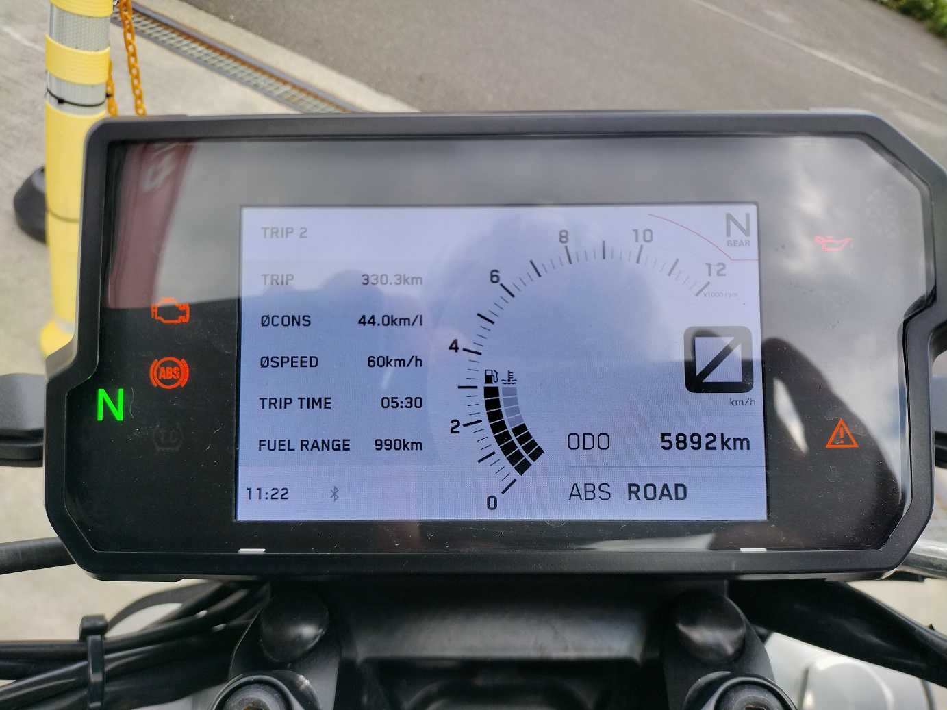 2025/8/11ツーリングの帰りに給油。走行距離 330.3km 給油 7.69L 燃費 42.952km/L燃費表示は 44.0km/L総走行距離 5520.1km 給油 131.41L 燃費 42.007km/L