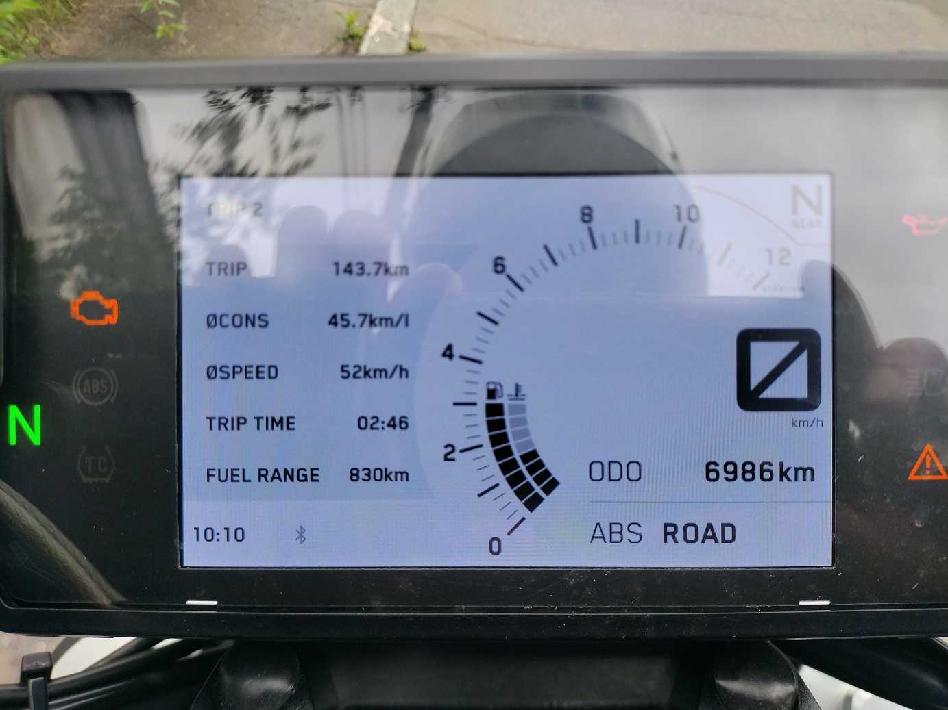 2025/8/31ツーリングの帰りに給油。走行距離 143.7km 給油 3.78L 燃費 38.016km/L燃費表示は 45.7km/L総走行距離 6614.3km 給油 157.83L 燃費 41.908km/L