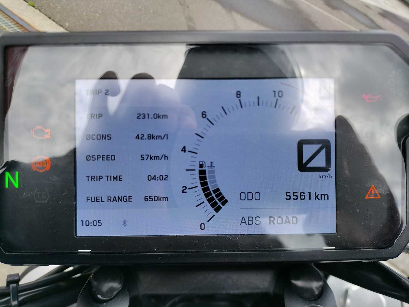 2025/8/10ツーリングの帰りに給油。走行距離 231.0km 給油 5.90L 燃費 39.153km/L燃費表示は 42.8km/L総走行距離 5189.8km 給油 123.72L 燃費 41.948km/L
