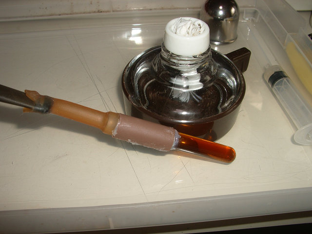 シリコンだと柔らかいので、簡単に巻けるのですが、これは、少しランプで焙って巻きつけました。