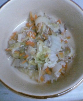 高い高い野菜ですが、昨日たまたま寄ったスーパーで白菜4/1が100円!えのき1袋100円!(これでも安いのです~)(この辺は、ゼッタイ大阪市内より物価が高いぞ)さっそく買いです~白菜の土鍋蒸し煮白菜4/1を幅1cm位にざく切りにします。にんじん1本・えのきはフードプロセッサーで粗みじん切りにします。鹿肉(GEN-MEATさんで購入)を細切れにします。鶏肉、豚肉、(リッチな方は牛肉でも)いいです。土鍋に水100cc入れます~白菜、にんじん、えのきを土鍋に入れます~一番上にお肉を乗せます~弱火でぐつぐつ煮込みます~(お水が少ないので、必ず弱火で。強火にするとこげちゃうよ~)お野菜からおだしが出て美味しいのです~水をたくさん使わずに蒸し煮にすると栄養も逃げないのです~たくさんできる(けんけんだと3回分位)ので、残りは冷凍してある時は、豆乳足して再度煮る。スキムミルクとお水を足して煮る。とろみをつけた、ミンチ(味付けないでね)をかけてあげる。等など色々バリエーションできるのです~今起きたん(9時45分)*********************************************************************交通事故のクックちゃん、がんばってます~前足ではって体を動かしているそうです。クックにご支援よろしくお願いします~クック~ガンバ!*********************************************************************