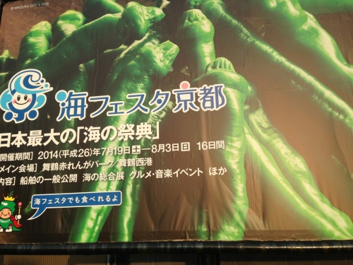 「海の日」が7月の第3月曜になったのは、平成15年からなのだそうですが、これにより7月に3連休がとれるようになって、この時期、遠出する機会というのが増えているように思います。そんな中、今年は、京都北方の町、舞鶴へと出かけてきました。この「海の日」の3連休化に伴い、国が推進している事業の一つが、「海フェスタ」というイベント。これは海についての認識を深め「海の日」本来の意義を再認識してもらおうという趣旨のもののようですが、毎年、この時期に、全国の主要港湾都市で実施されていて、第11回目となる今回は京都が開催地。舞鶴を中心とした7つの市町村が共催という形で「海フェスタ」の催しが実施されています。 海フェスタ京都PRポスターのひとつ。 舞鶴特産の万願寺とうがらしをモチーフにしたものです。その内容はといえば、様々な企画展示とともに、セミナーやシンポジウム歴史見学会や映画まつり、コンサート、花火大会など、帆船や海洋船の一般公開もあったりと、本当に盛りだくさんです。行って見ると、会場があまりに多くの人で賑わっていたのには驚きました。そうそう、グルメ対決のコーナーなんかもありましたよ。今回、舞鶴を訪ねたのは、特に「海フェスタ」が目的というわけではなかったのですが、魅力的なイベントがいっぱいで、これは、さぞ楽しいんだろうなと思いながら見ていました。でも、そうした「海フェスタ」の賑わいの中、舞鶴の歴史史跡をめぐることにします。舞鶴といえば、明治以来、軍港として発展してきた町。今も、海上自衛隊がその施設を引き継いでいて、艦隊活動の中心拠点のひとつともなっています。この舞鶴が軍港として発展していく、そのきっかけとなったのは明治34年(1901年)のこと。日本海側に、ぜひ軍事拠点を置きたいと検討を進めていた旧日本海軍は、その最適地として舞鶴を選び、ここに鎮守府という軍事拠点を設置しました。その初代長官には、東郷平八郎を任命。これは日露開戦の、およそ3年前のことであり、ここをロシアに対する戦略拠点として位置づけたいということだったのであろうと思われます。その後、舞鶴には兵器庫・砲台・造船所などの施設が次々と作られていくことになりました。舞鶴には、その当時の建物のいくつかが、今でもそのまま残されていて、中でも、元兵器庫であったレンガ造りの建物群は、特に有名です。平成20年には、そのうちの6棟が、国の重要文化財にも指定されています。さて、次に、海軍の町・舞鶴ならではの、見どころをご紹介しましょう。それは、海上自衛隊が所有している艦船の特別公開で、自衛隊桟橋と呼ばれている岸壁に停泊している軍用艦をすぐ近くで見る事ができ、また、その艦内を見せてもらうこともできるのです。見学をするには、自衛隊桟橋の受付に行って、住所・氏名・年齢などを記入し、許可証をもらうだけ。入場は無料です。岸壁に入っていくと、この日は、護衛艦「まつゆき」、護衛艦「みょうこう」、補給艦「ましゅう」の3隻が停泊していました。すぐ近くまでいくと、さすがにすごい迫力です。また、この日は、護衛艦「みょうこう」の艦内が公開されていました。タラップのような階段を登り艦内へと入っていきます。入っていくと、制服を着た自衛隊員の人が、大きな声のあいさつで出迎えてくれました。軍艦の中に入るのは生まれて初めての体験で、ちょっと緊張です。部屋の中には、もちろん入ることはできませんが、それでも、外から見るだけでその頑丈で精密なメカニックの塊りであることが察せられます。護衛艦というのは、現在の自衛隊における主力艦。その搭載されている兵器というのも、また、すごかったです。目標物を自動的に追跡する機能を持ったミサイル1分間に4500発を発射することができる機関砲潜水艦を攻撃するための魚雷などそれらの実物を、すぐ近くで見れたというのは、またとない機会であったと思います。ところで、舞鶴では、この自衛隊桟橋以外にも色々なところを訪ねました。舞鶴港内、海軍ゆかりの港めぐり。自衛官OBの人が、港内の色々な施設について説明をして下さいました。赤レンガ博物館。レンガを作る窯を再現したコーナーもあったりとか、レンガに特化したその展示内容は充実していました。海軍記念館。自衛隊の施設内にある展示棟。日本海軍の歴史や歴代将軍たちの遺品など、が展示されていました。さきにも、少し触れましたが、この舞鶴というところは、東郷平八郎が、日露戦争の海軍総司令長官として出征する前に過ごしていたという東郷平八郎ゆかりの町。この舞鶴の町の通りの名前というのも特徴的なもので、「三笠」「初瀬」「敷島」「朝日」など、日露戦争当時の主力艦の名前がつけられています。まさに、司馬遼太郎さん「坂の上の雲」の世界。私も、この愛読者だっただけに感慨深いものがあります。舞鶴というところは、明治期の、海軍の歴史を偲ぶには、とても味
