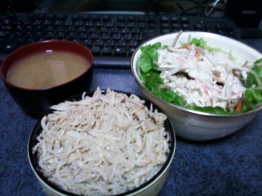 こんにちは、ぐんかんです。深夜勤が終わりました。明けの今日は、帰ってきて友達と電話した後、爆睡。(笑)このブログを書き終わったら、楽天プロフィールのコメントマラソン開始です。(笑)「牡蠣三昧」では皆さんコメントありがとうございました。今夜の夕食は余った材料の処分。炊き込みご飯に使った牛蒡の残りでサラダ。なめこの味噌汁にしらすぶっかけご飯。まぁ、いつもはこんなモンです。(笑)醤油で和えたしらすを、ご飯にぶっかけただけ。シンプルですが、こういうのが一番旨いんですよね。イワシの稚魚らしくほんのり香る青魚の香りに、醤油の香りが絶妙なハーモニーを奏でだす。ん~、うまい!!以上、ぐんかんの「いつもは・・・。」でした。