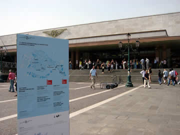 ミラノやヴェネツィアのような大都市になると、イタリア鉄道の駅名には都市名だけでなく、付近の教会の名前などが付記されたりして区別されます。例えば、ミラノにはミラノ・チェントラーレ(ミラノ中央駅)やミラノ・カドルナのように、ミラノだけでもいくつかの駅があります。同じようにヴェネツィア本島の終点の駅は、ヴェネツィア・サンタ・ルチア駅。イタリアでの表記は「VENEZIA S.L.」と省略されて表記されます(ちなみに、ミラノ・チェントラーレは「Milano Cle.」ね)。ヴェネツィア大好きな猪股にとって、列車のなかの案内放送で「ヴェネツィア・サンタ・ルチア」と流れるだけで、もう気分はウキウキ。まるでワイキキにでも行ったようです(笑)。そんな浮かれ気分で到着する終点はこんな外観。▲ヴェネツィア・サンタ・ルチア駅駅前はすぐ運河になっていて、こんな感じです。駅前のわき道を入っていくと、ピアッツァで観光客相手の土産物屋さんが並んでいて、ヴェネツィア名物”カーニバルの仮面”を売っていました。ちょうどお昼時に到着したので、近くのトラットリアで昼食をとり、常宿のあるサンマルコ広場にヴァポレットで移動します。▲旅行のパンフレットでおなじみの風景(笑)サンマルコ広場入口のドゥカーレ宮殿と溜息橋のあたりは現在工事中。ランチアが囲い看板のタイトルスポンサーとなっており、新型デルタの広告がなされていました。こういったものを見かけると、日本でも同じようなアイディアを取り入れて、税収の足しにしたら良いと思います。感謝!