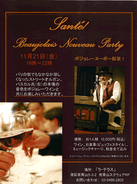 今年のミシュランガイドでも、目出度く2つ星を獲得した青山のピエール・ガニェール”ラ・テラス”で、ボージョレ・ヌボー・パーティが開催されました。ミシュランガイド東京2009私は普段ワインをあまり飲まないので、ボージョレの収穫祭にはあまりご縁がなかったのですけれども、美女にお誘いをいただいたので、いそいそと出掛けていったところが真相です。お店も錚々たるところですが、いらしている他のお客も超がつく綺麗どころばかりで、こちらは目が回りそうです(笑)。今年のパーティの目玉は、パリのモンマルトルなどで観光客にはおなじみのストリートオルガン奏者、パスカルさん。ストリートオルガンは名前に「オルガン」と入っているので誤解しやすいところですけれど、仕組みはパンチ穴のあいた楽譜を読ませるアコーディオンのようなもの。パスカルさんは、陽気に歌いながらビル屋上のテラスを一周して人気者になっていました。▲ストリートオルガン奏者パスカルさん。携帯カメラなので光量不足。すみません。このパスカルさんは日本語がとても上手で、日本語でオルガンの解説をされていましたが、80年近く前の古いものなのだとか。80年前の楽器なんて日本では骨董品ですがあちらでは立派に現役だそうです。良いものを長く使う習慣は是非見習いたいところですね。さて、本題の今年のボージョレの出来映えですが、こちらが音痴なのに加えて、ボージョレやら他のボルドーやら、仕舞にはブルゴーニュやらがグラスにどんどん注がれて、後になるにしたがって(酔いが回るにしたがって)どんどん複雑に美味しく高級になる仕組みになっていたため、最終的には全部美味しかったという感想になりました(笑)。こうして週末の夜も更けていき、晩秋のパーティを楽しみました。青山の夜って楽しいですね。感謝!