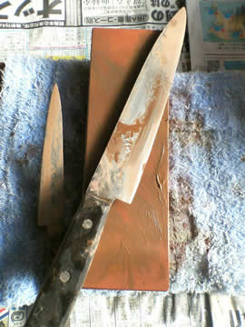 世間様には包丁道なるものがありまして、流派によって日程は異なりますが、包丁式という儀式が行われています。私も独身ということもあって、食べるものは自分で作らないと食えないものですから、包丁には思うところがあり、切れる包丁ほど美味しい料理を作る技術はないのではないかと考えたりします。本来ならば新年にやるべき我流の包丁式も、そういう背に腹は換えられないいささか哀しい事情から、年末も押し迫った晦日の日に行いました。わざわざお披露目するほどのことではありませんので、今まで書くことがありませんでしたけれども、私は包丁研ぎが大好きで(笑)、暇はあるが金はない学生時代には毎週研いでおりました。もちろん昨今はとても毎週研いでいる時間などありませんので、どうしても時々になります。本当なら片刃が好みなのですが、研ぎの事情から今回は両刃に刃を付け直しました。これで暫くは大丈夫でしょう。ここで大切なのは、包丁に拘るか研ぎに拘るかでございまして、包丁に拘ると先は料理なのですが、研ぎに拘ると先は砥石ですから、拘る先は包丁でありたいものです。そういえば、昨今は結婚しろとか結婚しないのかとか周囲の皆様方からご心配をいただいているところなのですが、蛸引きを持っているなどと言おうものなら、今どきの女性の皆さまはよもや刺されるのではとご心配になられて、こちらが背を向けられてばかりということですよ。蛸引きは尖ってないはずなんだけど(笑)。感謝!