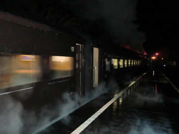 昨秋から列車で旅に出たいと思っていたのですが、もう満足がいくような客車列車はほとんど無くなってしまいまして、ちょっと途方に暮れてしまっていました。そんなときに客車列車でしかも蒸気の暖房だというので、喜んで出掛けてきました。21世紀は電気の世紀ですが、20世紀は火力の世紀でした。核融合による原子力は今世紀後半から来世紀のものでしょう。今や暖房といえば何処でも何でも電熱ヒータが当たり前ですが、火力が主力の前世紀には使用する熱源によってヒータもバリエーションがあり、蒸気で列車を動かす場合には動力から蒸気を分けて客車の暖房にも充てていたのです。蒸気による暖房は、湿度たっぷりでほんわり温かく電気にはないぬくもりのある味わい深いものでした。客車列車への拘りというのは、どちらかといえば快適とは程遠いものなのですけれども、蒸機列車の味わいは他に代えられないほど深いものがあり、上り勾配のトンネルに入ろうものならドラフト音に加えて、煤の匂い、ボギー台車の振動、窓枠の軋む音などが渾然一体となった交響曲に包まれます。同じようなことは、きっと日本の彼方此方でもあるのでしょうが、ことそれが夜の出来事となると、老いも若きも男も女もどこかが狂うのではないかと思うくらいその旅情に酔えるものでした。また、そこでお茶を片手に弁当などを頂くことになると、それが小説の中でも映画のなかでも夢の中でもないリアルな現実だということに無上の至福を感じるものです。感謝!