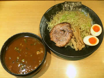 ずいぶんと久しぶりになってしまいましたが、今月のスペシャルの時間です。1月以来だから5ヶ月ぶりですか?もう、はっきり言います。傑作です!当のマスターご本人も胸を張って「傑作です」と仰ってます(笑)。これはこれは大変に良い物でございまして、濃厚な鰹節で摂ったダシに、とんこつスープと野菜を煮込んだスープで作ったフルボディのつけだれと、なんとこのために麺メーカに交渉して特別に作ってもらったという、喜多方ラーメン風の極太ちぢれ麺がしっかりと絡み合ってグー!!ですが、さらに麺にはせん切りにしたレタスが入っていて、濃厚一本で突き進みそうな豚骨醤油の味に一服の清涼感を与えています。今やすっかり定番になったラーメンの豚骨スープというのは、実はただ白濁したたんぱく質のスープで味がないというのが真実だったりするのですけれども、だから多くの店では「うま味調味料」を入れて味を作っていたりするところを、とんこつに負けないだけの強力なダシを鰹節で摂り、野菜のうま味と甘みのスープを加えて、最後に醤油で味をつけるのですから、天然モノの野性味に溢れた素材それぞれの美味しさがハーモニーを奏でる極上の一品です。先月のスペシャルメニューだったそうですが、早くも大好評で常連さんのハートをガッチリ掴んだそうで、皆さまの期待と心配と不安に見事応えて今月も食べられる本当のご馳走です♪今月もまた時間を作って通わなくては!!!大感謝!