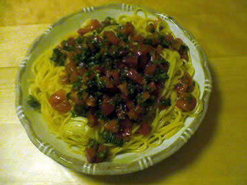 今年の夏は暑いことは暑いですが、梅雨明け前に酷暑、梅雨明け後にぐずつき、大暑過ぎは雨が続いたりしていてどうも天候の変動が例年とは違うようで、こちらも勝手が違って弱りました。しかし、お盆の時期になると自然は業のようにお盆らしい蒸し暑い陽気となりましたので、こちらも暑気払いの食べ物を食べ精をつけなければということから、例年通りのスパゲッティにご登場願ったわけでございます。いやなにイタリア語で書いてありますが、要するにトマト・スパゲッティです。▲Spaghetti ai pomodori fresciフレッシュトマトなる注釈がついているのは、ふつうのトマトソースがソースになってしまっているからで、こちらのオリジナルはトマトとパセリのマリネを茹でたスパゲッティの上に乗せるだけというシンプルこそが一番を狙った簡単レシピです。これ、私のオリジナルなのですけれども、意外や意外に笑っちゃうほどイケるので、暑い時期になると時々作って食べてます。おすすめですので皆さまも是非どうぞ♪感謝!