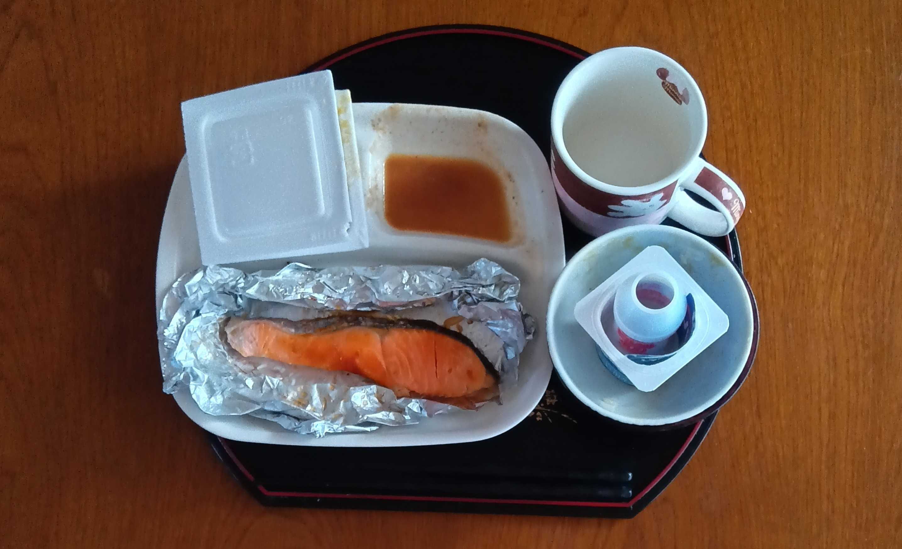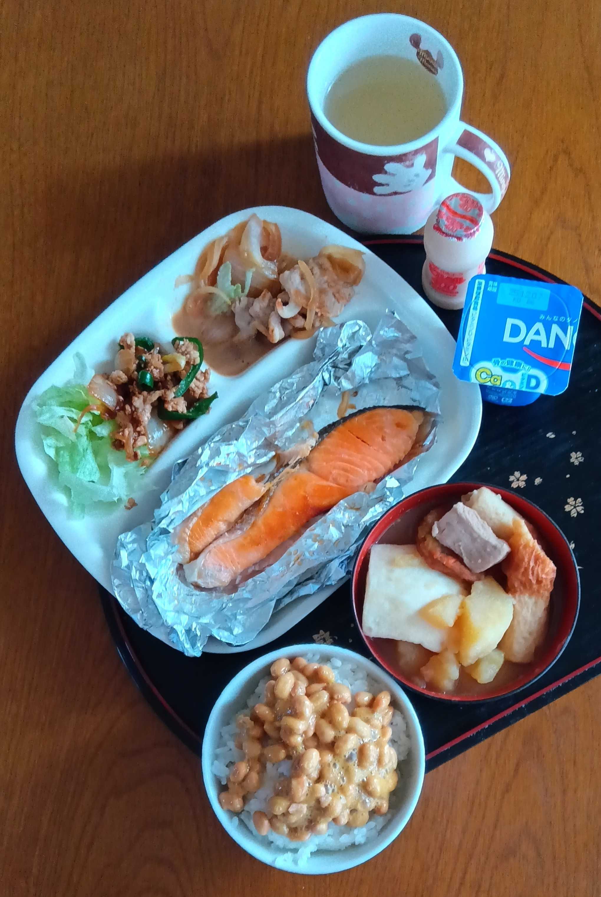 豚肉炒めと鶏そぼろ炒めと焼き鮭、おでんは昨夜のおかず。