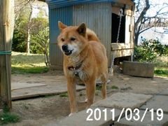 本日、ウチのお犬様が、逝った・・・。散歩の途中にパタリと・・・。散歩が好きだったので、それは、良かったのかもしれない。実は、3月末頃から具合が悪くなっていたんです。そろそろ危険かもしれないなー・・・、と思えていたけど、まさかそれが、今日とはねー・・・。はっきりとした年齢は不明ながら、約10歳、いや10歳以上のはずなので、寿命だといえば寿命なのかもしれない。ちょうど甥っ子と姪っ子が遊びに来ていて、姪っ子が、お犬様の頭をなでてやった後に散歩に出て、そのまま・・・。既にウチの敷地内に埋葬しました。ある意味、子供たちには、良い勉強になったかもしれない。最後に撮った写真は、あの地震の後の2011年03月19日。この時は、まだ元気だったのにね・・・。お犬様、ありがとう!冥福を祈ります。合掌・・・。
