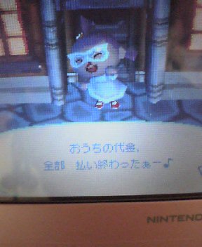 120000円のローンを払うべく…ひたすら、貝を拾ったり…木になってる果物食べたりしてたんだけど…。全然返せてない…。。。(´c_`;;)ゞウウウウウ…高いっ。。。でもだんだん高くなるんだよね…。で、、ビックリだったのが…化石!!すでに寄贈されてるものって返してもらえるけど…ナニゲに売ったら…。。ちょおお高額だった…。。ビックリヽ(´Д`ll)ノ住人のロボくんが…風邪をひいた!!!ロボくんにゎ、、手紙と一緒にラブリー絨毯をもらったので…。。恩返しでその日に…お見舞いに行って薬を渡した…。。。。次ぎの日に様子を見に行ったら…。まだ治らないらしく…薬をクレーってまた言われた…。。ッチ!!なんてやつ。。。笑で、、薬を買ってあげたいんだけど。。。。たぬきちのお店ゎ…コンビニからスーパーになる改装中のため…今日ゎお休み!!!!ぶーーー。。。。モノも売れやしない…。。モノが貯まるいっぽう。。。クローゼット買ってたから…大量に収納できるけど…。釣った魚ゎ、、クローゼットに収納不可能な為…。そのまんま、、バッグの中…。。邪魔!!!!!!!!!!!!!ああ…もしかして…???クーラーボックスって…あれって…?魚はいるのかな??売ってしまったし…(*≧д≦)ってなワケで、、今日ゎ洋服のデザインとか…考えたりしてたんだけど…暇すぎる&お金ナイ、、、ので、、かなり…たいくつぅ。。。でも今朝、海岸を散歩してみたら…。。。ラコスケに会った!2回も…。一回目ゎナニもくれず、、意味不明な事言い出して…。。ぇ?って感じだった2回目…またも変な事言ってたけど…。アイテムくれた…、、、、、、でも、、イラネー。。ってモノばかり…だったぞぉ。。。ラコスケめっ!昨夜ゎ、高級家具店?みたいのがあって…テントみたいな店で…。会員以外入れないとかって…。合い言葉があって…、、、、やっとの思いで合い言葉を住人から聞き出して行ってみたらさ、、、全然、たいしたモノ売ってないのに…高い&入会金とかとられたぞ!?今日も行こうって思って、、歩いてたら…、、、、、、、、あっったハズの所に店ゎなく…。。一夜限りの店?だったのかな…。。。入会金とか…、、返せ、、、(|||-ω-)ボッタクリ。。。。通報するぞ。泣家具もだいぶ多くなってきて…。部屋が狭く感じるよぉん。。。早いところ…ローン返済して…新しいお家にしなきゃヽ(*´∀`)ノマイルーム♪こちらデツ、、それに…最近、、、やたらと。。。住人…増えてキタ、、別にいいけど。。。誰が誰だか…さっぱりわからんくなってきたぁ。。_| ̄|○一日…一匹ゎ引っ越してきてる…。。何人くらい引っ越してくるんだろう?謎。釣りゎ、、川より、海岸の方が釣れるんだねぇ。。。海岸に入り浸りの日々、、、釣り大会楽しみぃーん。練習ゎしたぞぉ。。。。『あじを釣り上げた!さて、味ゎいかほどか…』ってコメントも可愛い♪他にも…『イカを釣り上げた!ゲッッソー』とか…・・『鯛を釣り上げた!めでたい!』とか…。。。プププって笑える可愛いコメント言ったりするぅ。。ニクイねぇぃ。