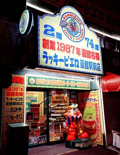 目次はこちら 夜ご飯はココにしよう!! ラッキーピエロ 昼間に本店を見に行ったら、 スゲー混んでたので諦め 函館駅前店へ。 店は2階。 入店すると既に長~い行列。 手持ちメニューが無い...Σ(゚Д゚|||) 壁に貼ってあるけど、行列が進めば 見ることが出来ない... レジ上メニューは一部のみ。 結局 注文の順番が来て その場で決めてる客が多くて 時間がかかってるんの、だから行列。 hagi_hisa は、面倒だったので 「一番人気セット」にした。 ダントツ人気№1セット ●チャイニーズチキンバーカー ●オリジナルラキポテ ●自家製新鮮本物ウーロン茶 店内価格 1,001円也 大きめな鳥の唐揚げ3個入り。 唐揚げだけでもウマイな♪ シルク・ミックスソフト <HAPPY DAY>と称して 割引キャンペーンを多くしてて この日は「ミックスソフト」が半額。 税抜 300円 → 税抜 150円 へたくそすぎて笑う。 これもまた良い想い出。