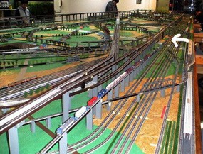 本日は予告どおり八王寺N広場に行ってきました!今回は正式開店前の無料お試しで。場所はJR中央線、高尾駅前です。現在、約50%の完成度で、4月29日開店の予定だそうです。 さて、1時間しかないので、今日持っていった編成は4本!1)EF200+コキ100系列26両2)DE10+ヨ80000+シキ800+ヨ800003)JRC 371系4)小田急 RSE 20000系 いやぁ、とにかく広いです。そして、1エンドレスが長いです。一番遠くに行ったら、どこにいるのかわからないです。そして、一番すごいのが長い直線に12本が並ぶところです。ここに12本が埋まったら、大迫力でしょうねぇ。 それにコントローラはTOMIXのサウンドコントローラが標準装備!それが12台もあるんですよ。144万円はかかっているぢゃん! それでは、写真と共に今日の風景を。写真はいつものカメラぢゃないので、小さくなっちゃいました。すみません。 まずは、コンテナ編成。26両を何とか用意して持っていったのですが、これだけ広いと26両なんて短いですねぇ。写真の白い矢印がお尻です。直線の半分にもなりません。おそるべし。 ちなみにコンテナは、コキ106にだけ、トレコレの海上コンテナを積みました。 会場の全景もこの写真でほぼ確認できますでしょうか? 次は、先日購入して、短いエンドレスで試運転しかしていなかった、2社のあさぎりです。どこかでの交換風景でいいですねぇ。 続いて、私のお気に入り、JR東海371系です。勾配を上っていく姿がたくましいですね。 最後は、シキ800の編成です。カーブが気になりましたが、高架の線ならば問題ありませんでした。 ということで、皆様もぜひ一度足を運ぶことをお奨めします!オフ会をここでやりますか?(ウソです)