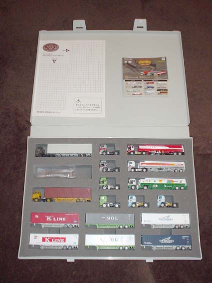 トレーラーコレクション第1弾とワーキングビークル Vol.5(大人買い)をいつものお店に取りに行ってきました。TOMIXのあさかぜセットも届いていたのですが、あまりにもいっぺんに届いたのでお金が用意できず、とりあえず取り置きしていただきました(ありがとう、おばちゃん)。 で、今日はトラックいっぱいの紹介です。 工作の内容ですが、トラックコレクション1&2、トレーラーコレクションのパーツを取り付けました。 と、その前に、今日のメントレでゲスト石坂浩二が出ていましたが、プラモデル部屋3つも持っているんですね。すごい!そして、未だに妻に怒られているというのもすごい!プラモデルが本当に山のようでした。見習わなければ(違うか?)。 さて、本題ですが、まずは待ちに待ったトレーラーコレクションです。開封すると、残念ながらシークレットは含まれていませんでした。 それを早速、先に買ってあった専用ケースに収めてみました。いい眺めですね。このコンテナをコキに積むのもよいのですが、私はトレーラーに積んだままがけっこう気に入りました。GAGAさまのようにもう1セット買う運命か?コキ用に。 で、もう一つのワーキングビークル5のミニバスです。こちらはシークレットが入っていました。その代わりの江ノ島電鉄バスが欠けてしまいました。江ノ電バスをヤフオクで調べたら、けっこう人気ですね。どうしよっかな?どなたか譲ってくださ~い! 第3弾の時もシークレットが入っていて、一つ欠けたのでオークションで手に入れました。なんとその時のお相手がむ~みん551さんだったです。今思えば不思議な縁ですね ということで、今日はNゲージストラクチュアとしての自動車をいっぱい入手したので、思い切って全部広げてみたいと思います まずは、箱から。トミーテックの3箱とバンダイの5箱です。 次に箱を開けて並べます。まずはトミーテックのトラックコレクションとトレーラーコレクションです。で、私は昔の車種は使うつもりはないので、未だ箱から出していません。省いちゃってすみません。 トミーテック製、できがよいですねぇ。 そして、バンダイ製ワーキングビークルです。 これだけいっぱいあると迫力ありますね~。後ろにはトラコレ、トレコレもありますよ~。妻に怖いと言われてしまいました。オイラは一人酔いしれてましたが。 手前から第5弾です。第3弾のサカイ引越センターがむ~みん様から譲っていただいた物ですよ。 そして、おまけですが、石油会社3社のタンクを並べてみました。TOMIXのガソリンスタンドを買って、置いてあげたいですね。 今日の日記、いかがでしたでしょうか。トラックいっぱいの日記、貨物、トラック好きのご満悦タイムでした 今日の工作1時間、出すのに1時間、しまうのに1時間、合計3時間。何やってんだかなぁ