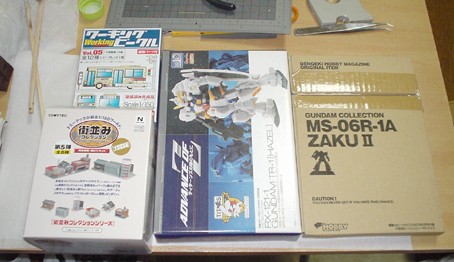 今日は、うなぎ登り様のところで100000アクセスのキリ番を、GAGA様のところで30000アクセスキリ番をゲットしてしまったようです。 とってもラッキーなのですが、オイラばっかりで申し訳ないです。ありがとうございます。とともに皆様すみません。 で、オイラのブログもあと500弱でキリ番30000です。次は50000アクセスで景品を考えていたのですが、これは出さないわけにはいかないでしょう。 ということで、すぐに考えます。時間がないので、きっちり30000キリ番です。該当なしの場合は直前の方に。 参加資格はゲストさんはNGで、いつもコメントをいただいていると私が認識している方に限ります。 で、物はすぐに思いつきません。用意していなかったので。 ということで、一大決心! 本日昼の日記で、皆様から悪魔のささやきをいただきましたので、これを買うことにし、そのアフィリエイト分をキリ番の方から買いたいと思います! もちろんそれ以外にも、何かしら”物”を今から考えます。アフィだけぢゃたかだか60円ですからね。明日の朝までに決めなきゃなぁ。 ちなみに最近のアクセスは、日記を書かないと100ちょっと、書くと200ちょっとです。それでは、がんばってキリ番狙ってください! で、翌朝追記です。 景品は、アフィ六十数円と、次のブツの中からご選択です。最近はガンプラ関係もちょこっとやってるので、そちらがよい方にも備えて。1)街コレ5 劇場or銀行(二種あるのでどっちかをお譲りします。劇場は未組立、銀行は組み立てちゃいました。)2)ワーキングビークル5ミニバス1台3)電HMのおまけ2個(ヘイズル?、ザク)写真↓の右二つ4)ガンプラ旧キット ジオング