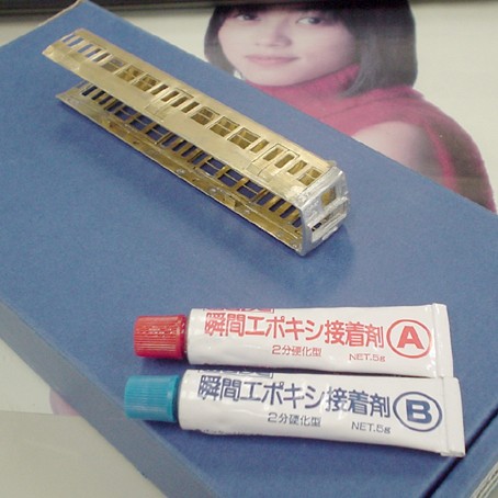 静鉄100の続きです。 1両目のお面2つが接着終了しているので、今日は継ぎ目の修正です。 まず、はみ出しぎみに盛ってしまったエポキシ接着剤を除去です。先日、む~みん様から教えていただいた情報ですと、経年で膨れてしまうとのこと。キャー、そんなことあったら大変です。なので、表側にははみ出ないように削り取りました。昨日の写真と比べてみてください。つやが違うからわかると思います。 そして、裾部の絞りをお面パーツにつけます。少々きつめに絞っている感じはしますが、Nゲージサイズですから、多少オーバーでもよいと思い、しっかり削ってます。もちろんリューター大活躍ですよ。本当に効率アップです! と、片側のお面を修正したところでタイムアップです。 ←ホワイトメタルと真鍮を、これで接着しました。 ←これを使って、ガンガン整形します!む~みん様のお奨めで買いました。<静鉄100のこれまでの作業> 作業日数 計21日 作業時間 今回約40分、計約12時間30分 2006年1月24日 製作開始