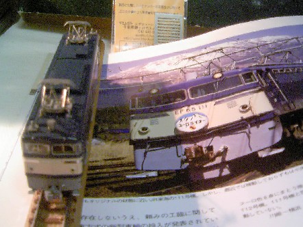 今月3日目の久々の工作です。先週から体調不良やら、お家買い替えのことやらで、最近お疲れモードでした。 さて、本日の工作は、TOMIXのEF64です。先日決めたとおり、ユーロ色製品の66号機(厳密にはプロトが違ったんだけど)を、国鉄色の55号機にします。 というのも、最近調査を続けている5463レの重連列車に仕立てるためです。もう1両はKATOとマイクロエースの製品でも買ってみようかな?オークションで安いの探すとしましょう! TOMIX 【鉄道模型】 EF64 一般型↑のように塗り替えます。 で、作業ですが、前回、ナンバーの部分を接着し、パテ埋めしたので、今回はそのパテをヤスリ整形しました。作業は極めて単純ですので、それ以上書くことがないですね…。ということで、いきなり終了後の写真です。 今回、元の塗装は剥がしておりません。サフを噴いて、その段差が目立つようならば、ペーパーで仕上げる予定でおります。だって、もうラッカーパテ盛っちゃったから、シンナープールに入れたくないんだもん!というのがホンネです!(順番間違えた?) そして、前回、スノープラウを取り付けたと書いておいて、動力装置(台車)部分の写真を忘れたので、一緒に撮りました。 それから、55号機の実車の写真をネットで探すと、なんと電暖表示灯が撤去されてますね。なので、模型でも撤去作業を行う予定です。 そして、55号機に会える日を楽しみに、5463レの調査も続けたいと思います。 次の作業はサフ噴きですが、作業場所がただいまゴチャゴチャですぐにできません。(TロT) エーン。<EF64-55のこれまでの作業> 作業日数 計2日 作業時間 今回約20分、計約1時間 2007年2月2日 製作開始 それと余談ですが、我が職場の線路に、ある車両の二次車が到着しております!先ほど見てきました。斬新な色でむむって感じがしましたが…。 機密保持があるので、こんなことしかかけませんが、何だかわかりますかね?