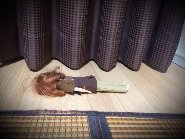 リビングの端っこで事件!! ミスタードーナツのリカちゃんが!!! 娘に久しぶりに出されて、髪の毛をこねくりまわされて、ポイっとされました(-言-)