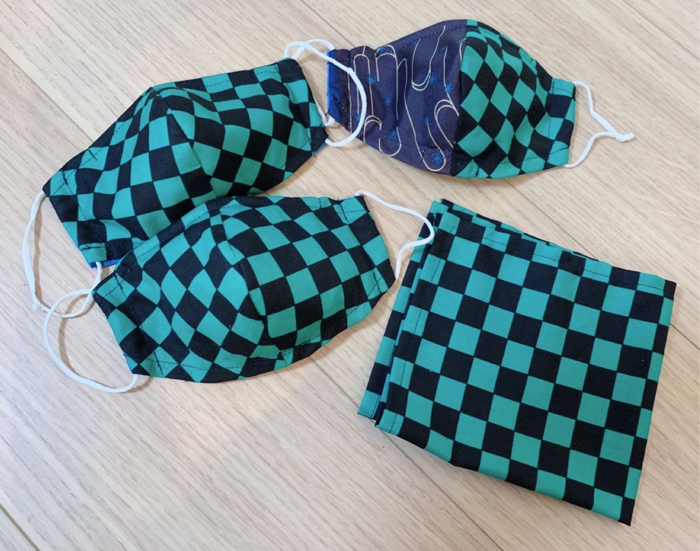 鬼滅の刃ブーム。。。 娘が去年のクリスマスのプレゼントに鬼滅の刃マンガ本セットが欲しいということで、我が家にブームがやってきました。。 息子は最初はそんなに興味がなかったのに年明けからヒマだったのかマンガを読みはじめアニメも見出したらすぐに虜になってしまいました。。 8月のお誕生日プレゼントは鬼滅の刃のグッズが欲しいということで、、 生地をメルカリからかって、自粛で仕事がお休みなので、せっせとグッズを制作しました!! マスク、ハンカチ、ランチョンマット、ランチョンマット入れ