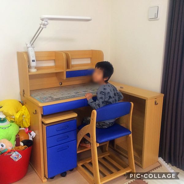 今日、息子君念願の机が届きましたー!! 机はニトリのコピタシリーズというもの。 色んな色がある中で息子君は青を選択。。 親的には、将来も使えるように黒が良かったんだけど、、まぁニトリは色の部分を取り替える事が出来るらしいので青で了承しました。。 娘の机は大人用の収納が天井まであるやつなので、娘は羨ましがってた(^_^;) 学校からの荷物がとにかく多くなるので、収納多めで良さそうです!!