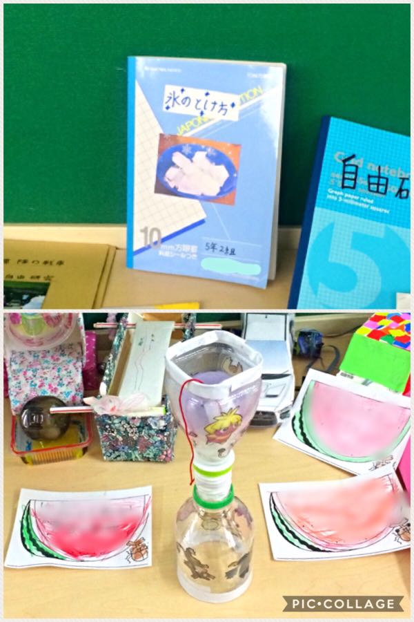 子供達の夏休みの宿題の自由研究が学校で展示されました♫ 娘ちゃんは、氷の溶け方の研究。 3年生以上は、工作はダメで何かを調べなくてはいけないのです。。 色々な調味料(マヨネーズ、ソース、醤油など)・洗剤などを氷にかけて、溶ける時間を計りました!! 地味に目が離せなく、写真をプリントしたり大変でした(^_^;) 息子君は、工作でOK!! ペットボトル2本を半分に切って飲み口同士を合わせて、ペットボトルけん玉を作りました!! 玉はガチャガチャのケース!! 大好きなポケモンのシールを貼って完成!! 来年はどうしようかな…