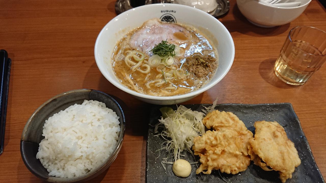 ごはん写真すぐる(京都市左京区修学院)味噌ラーメン&とり天・ごはんセット(800円+350円)とり天が抜群に俺好み味噌ラーメンは限定だったけど醤油の方が好きかもしれない。ごはん写真