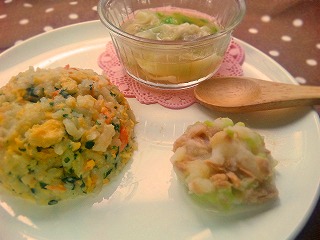 *お昼のミオごはん* 鮭チャーハン ・軟粥、鮭、ほうれん草、卵 ・醤油 ポテトサラダ ・ジャガイモ、キュウリ、ツナ ・野菜スープ、フォロミ ワンタンスープ ・ワンタン (ワンタンの皮、豚ひき肉、キャベツ、ネギ) ・白菜 ・野菜スープ、水溶き片栗粉 離乳食日記、久々な気がします(笑) 段々と普通の写メ日記が増えてきたー^^; 今回は中華風メニュー ミオも気に入ってくれたようでパクパク食べてくれたッ ワンタン、たくさん作って冷凍したんですが、 初めて作ったので茹で具合がわからず、半分は茹ですぎて グチャグチャになってしまった(´-ω-`) タネだけ出てきて、ただの肉ダンゴになりました!(笑) ワンタンの皮って・・・もろいんですねェ。ハハハ。 あ、写真のワンタンは 茹で時間短くして無事だったものです(笑) ミオの離乳食作りでようやくまともに料理するようになったので こんなんしょっちゅうですよ。(´∀`)はは。 いずれ人並みに料理の手際がよくなるだろうと 前向きに信じております!(`・ω・´)キリッ 話は変わって。 今日は午前中、2回目の児童館へ行ってきました。 ミオが月齢の近いほかの子とオモチャや滑り台で遊ぶようになった! 知らない大人が抱っこしようとするとやっぱ泣いちゃうけど。 この調子で頑張ろう~ ← ランキング参加中ポチっと応援してくれると嬉しいです★