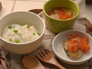 *お昼のミオごはん* グリーンピースご飯 ・軟飯 ・グリーンピース トマトチーズハンバーグ ・豆腐ハンバーグ (鶏ひき肉、豆腐、玉ねぎ、ひじき、卵) ・トマトソース (トマト、玉ねぎ、ニンジン) ・ピザ用チーズ カレー風味スープ ・ニンジン、カリフラワー、卵 ・野菜スープ、カレー粉(ほんの少し) 今日のご飯前のミオさん。 今日は笑ってくれたァ(笑) さァごはんですよー。頑張って作ったよー。 グリーンピースごはんかぁ。 うん。うん。(゚∀゚*) ささ、今日も手づかみにて豪快にドゾ!ヽ(≧∀≦) いらね。 えーーー!!Σ(ノ`д´|||)ノ まさかのポイでひた(。´Д⊂) 食べさせてあげたら食べたけど。 めずらしく3分の1程お残し。グリーンピース嫌い??(´Д`υ) これならたべるー。 ハンバーグがお気に召したようで手づかみで完食。 カレー風味スープはいまひとつなのか、3分の1お残し。(´ω`) うーん。今日のは食べっぷりがイマイチでしたなァ。 また次じゃ次!! *追記* え。今日って、7日???(・∀・;;) ・・・・・7草粥? ・・ナニソレ??Σ(ノ∀`*) ・・今日は6日だと、本気で思っていた私。 ・・・・・・・・・・・・・・・・・・。(・∀・) ま、いっか(笑)また来年(笑) ← そんな適当な私をポチっと応援してくれると嬉しいですw