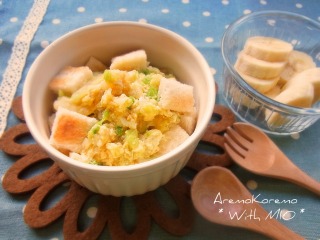 *お昼のミオごはん* パントーストの じゃが玉スープあんかけ ・トーストパン ・ジャガイモ、玉ねぎ、キャベツ、白菜、卵 ・野菜スープ、片栗粉 バナナ お昼はちょっと軽めなメニュー(´∀`)エヘ。 ミオがスプーンに挑戦中。 スプーンにすくって上手に食べれました! でも出来たのはこの1回だけ~^^; 何度やってもスプーンにすくえない。 しまいにはガチャガチャ叩いてるだけに見えてくる。。。 今日のところはスプーンは諦めて、食べさせちゃいました。 バナナは手づかみでどうぞ~ あ!バナナどれどれ。 ぱくっっ うんめぇ~~~!! 幸せそうでなによりです(´∀`) 今日も元気にご馳走様でした! ← ポチっと応援してくれると嬉しいです★
