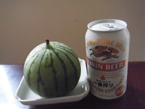 収穫時期・・ってゆうのではなく台風、雨・・でスイカのツル、葉っぱが枯れてしまったので仕方なく実を採りました大きさは・・こんなもん・・ソフトボールくらいかしら・・切ってみたら赤みが足りませんね~~それでも、スイカの香りはしましたが・・(当たり前っか)