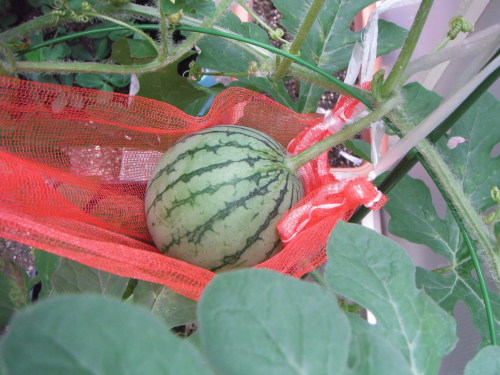 ソフトボール大くらいになってきたから、落ちないように、ゆりかご・・・今のところ、この一つだけなんだけど・・それだけに、より一層可愛い!収穫は9月初めくらいかなぁ~~孫ちゃんにはあげれないけど、見せてあげることは出来そうだなぁ~~