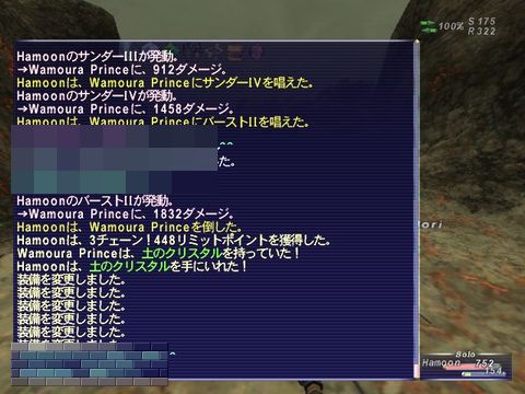 毎日暑い日が続いてますね・・・もうね溶けそうですよΩ\ζ°)チーンちなみに昨年12月のハムダス墨の力は(゚Д゚)ノ⌒こちら強化パーツ属性帯を求めて毎日アルタユに通い、残る組織1個を求めて・・・・先週の日曜から水曜まで4日間、毎日1~3時間くらいソロ狩りしてましたが組織0。・゚・(ノД`)・゚・。 なんですかこのドロップ率はさすがに余りのドロップ率の悪さでΩ\ζ°)チーン心が折れました。裏LSのツン猫シーフを拉致してトレハン頼みで先週木曜にアルタユに上陸王宮がドロップいいみたいとのことでシ・赤・黒の三名で狩り開始すると開始して40分くらいで組織キタ━━━━━(゚(゚∀(゚∀゚(☆∀☆)゚∀゚)∀゚)゚)━━━━━!!やはりトレハンの力は偉大ですね…(*´д`)b組織も揃って氷と雷属性帯完成(´Д` )イェイェイェァ少しワモーラで試し撃ちしてきたのでここ最近のハムダスの墨の徐々に進化した装備と威力を共に書いちゃいます。゚・*:.。. .。.:*・゜ハムダスX2007夏のヴァージョンアップ゚・*:.。. .。.:*・゜ハムダスの現在の墨装備と墨のメリッポ状況ハムダスX メインウェポン サテライトキャノン『プリケツは出ているか?』『あなたに死を・・・』『Ω\ζ°)チーン』ハムダス魔法フレーム 墨/垢 INT79+2(メリッポ)=81メリッポ状況 MP4段(+40) 精霊スキル8段(+16) 弱体スキル5段(+10)INT2段(+2) 氷属性攻撃力アップ5段(+10) 雷属性攻撃力アップ5段(+10)頭 デーモンヘルム+1 INT+6胴 イギラウエスキット 魔法攻撃力アップ+6 手 ゼニスミトン 魔法攻撃力アップ+5脚 マハトマスロップス INT+8 (ソーサラートンバン INT+3 曜日:精霊魔法効果アップ)足 イギトクラッコー INT+3 魔法攻撃力アップ+2首 ウガレピペンダント 潜在能力:(魔法攻撃力アップ +8)腰 ペニテントロープ INT+5 MND+5 (雷輪の帯 氷輪の帯)耳 モルダバイトピアス 魔法攻撃力アップ+5耳 ファントムピアス INT+1指 スノーリング INT+5指 スノーリング INT+5背 プリズムケープ INT+4 MND+4 杖は氷と雷の二本HQのままですΩ\ζ°)チーンこうやって纏めてみるとINTが81+装備37 合計118装備での魔法攻撃力が合計18 潜在発動時合計26ちなみに雷曜日に帯とAF2脚に換装してワモーラで検証すると食事メロンパイ INT+5 ウガペン発動時で↓見よ!ヴぇるでぃ!これが公の実力だ!てかハムダスがファーストジョブの墨を完ストした当時は装備も極貧でしたがサンダー4でワモーラに900台それが今じゃ・・・サンダー3で900台ですよ?まあ曜日と潜在込みですがΩ\ζ°)チーン以上ハムダスX夏の陣でした。これでまた死亡確率が上がりましたΩ\ζ°)チーン