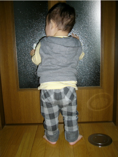 最近は,あちこち歩けるようになって,ドアというドアを開けて回ります。それから,ここではざらざらのガラスをおもちゃでこすって音を出すのがお気に入り・・・ガラスが割れたら危ないので,やめてほしいのですが・・・。
