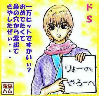 生まれて初めて‘お祝いイラスト’なるものを描いてしまった・・バージン捨てました\( ̄ー ̄;)よく「お祝イラストいただきました」って目にしていたのでいつか私も!って(笑)で、りょーさんの一万打お祝いに総たんを初描き!してみた。ヘタレ絵を大威張りでプレゼント・・よく考えたらすっげー恥ずい・・・りょーさんちで見た時はPCの前で誰も居ないのにキョロキョロσ(^_^;)息子に見せる前にUPしたのも初。(?どんだけ息子の批判にビビってんだ?)今は息子の希望でアニメ絵を見本にしてるけど、もともとデッサンのデの字もわかってない人間ゆえ、脱アナログとか言ってるのもおこがましいんだよね、ホントは。お絵かきバトンを受け取って下さったロータスさんが麗しい和服の銀さんをUP。彼女のような色塗りが出来たら一生アナログでいいんだけどなあ。