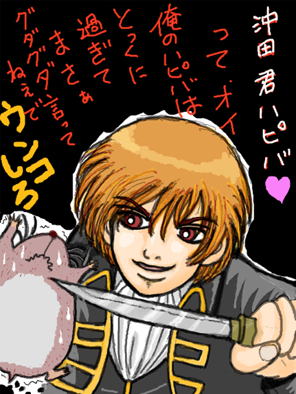 沖田君、一日遅れになってすんまっそんハピバ総悟7/8 拍手ぅぅぅ・・え”?な”、な”ん”・・・ ↑ 手ぶろで落書き 卍)))≡=‐\(・_ 沖田 遅れてすんまっせんんんんん~(´□`。)え”?許さないって?PCの前でウンコしろ??座高が上がるまでネット禁止ィ?( ̄□ ̄;)!! ってことで例によって慌てて手ぶろの落書きでハピバ絵を済ませるという暴挙忘れてたわけじゃないのよ総悟たん!ホント。し、仕事が忙しくてもうやっつけ本番のグダグダで 卍)))≡=‐\(・_ 総悟 総悟たんにバッサリ斬られて切り刻まれて来ますです。はい。 ← 手ぶろの落書きで済ませてごめんなさい