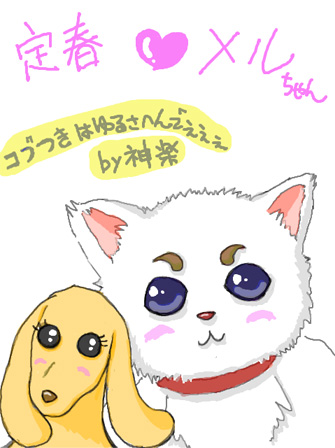 昔々ある所に一匹の定春スキーがおりました。ある日、定春の拍手絵を見てヨダレを垂らしていたそのアホのもとへ女神さまが舞い降りてこう言いました。貴方の欲しいのは‘金の定春’?‘銀の定春’?それとも‘モフモフの定春’?もちろん‘金’の定春を・・卍)))≡=‐\(・_ ・・ってことで、「銀魂の絵を裸にして見よう」・・じゃない「銀魂の絵を描いてみよう」の松平肩凝子教祖様ことゴリコたん(え?濁点いらね?)に‘定春欲しか~欲しか~~’と電波送ったところ見事キャッチして頂き拍手絵バージョンをちょっといじって定春部屋用に加工し直して下さりました。 イラストは大切な頂き物です。ここからのお持ち帰りは厳禁です わん! うへへへへ~(^o^)丿コリコたんありがとう!!テンションアゲアゲでお仕事めっさ頑張れる~♪早速‘定春部屋’に展示させてもらいますけん。ありがとうございましたm(_ _)m そして、もう一枚のメッチャ可愛いイラスト!いつも仲良くしてもらってます「徒然”腐”日記」のてんぽ~ちゃん。うちの駄ブログの10万+1万のお祝いに、こんなに可愛いイラスト頂きました~ イラストは大切な頂き物です。ここからの持ち出しは厳禁です メルヘンチックな定春ワールド。桃太郎は考えた事なかったな~銀さんの桃さんに神楽ちゃんのお猿さん。駄メガネのキジさんは新八くん。当然犬さん定春ゥゥ~桃太郎で万事屋ファミリー!!考えつかなかった定春ワールド。 さすが語り部クィーンのてんぽ~ちゃん!素敵可愛いイラスト感謝感謝です!嬉しいな~~定春部屋にこちらも展示させて頂きますねありがとうございましたm(_ _)m ← 定春と○○部屋入口。よければ覗いてやって下さいまし。 ←定春と愉快な仲間達の部屋は これからも増設して参りますのでヨロシクであります!