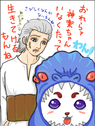 待ってたよ~!星海坊主さ~~~んとにかくたまらん好いと~!!中身と外観のギャップ萌えってヤツね(笑) さて今週の‘より魂さん第29回’は 当時の放送話数で行くと 第40話 「子作りは計画的に」 いやもうこのタイトルでOUTだろ(笑) えいりあんがなんぼのもんじゃいィィィ「えいりあんVSやくざ」時間調整でカットされるかと思いきや、今回の話にグッチョリ食い込んでたんだよね。でもこれってマジ見たくね?(マヨラーご推薦だし)え?「となりのペドロ」派ァ? 今回の話は永遠のテーマ‘娘離れ出来ないオヤジ’の話。ま、娘の方が先に父離れしてるってのはてっぱんで。 娘が心配で迎えに来たパピーこと星海坊主。拙者拙者詐欺に引っ掛かかり~のえいりあんに襲われ~のの神楽ちゃんのもとへ。(銀ちゃんの為にと必死に‘振り米’する神楽ちゃん、とっても可愛くね?)娘にウスラーと言われて‘ハスラーみたいでカッコイイか’っていいのかそれで(笑) 万事屋と言う止まり木を折りたくなければココを去れと言う星海坊主へココにいれば自分は変われる、銀ちゃん達と一緒に居るんだと神楽ちゃん。どこの馬の骨ともわからぬ天パ野郎に娘取られるオヤジの気持ち、わかるよ、うん。そんな神楽ちゃんにお前にゃ地球は狭い、オヤジと帰れ、これでサヨナラだと銀さん。どうする神楽ちゃんんんん・・・ 切ないね~親子一緒の方が幸せだって思ったんだよね、銀さんは。 それにしてもやっぱ星海坊主さんの中の人こと速水奨さん!よか声やわ~~顔の隠れたミイラ男のゴーグルメットで現れた時はみんなどんなナイスガイ!って思ったよな、きっと。それがウスラーのちょび髭中年オヤジだもんなwwでもあれだよ。この話まではまだ、わずかながらもうすらってたんだよね。完全なゲ~ハ~になるまで残すところあと二話・・あ~これって全三話なんだよね。より魂さんで初めてじゃね?長編。 ← 手ぶろで落書き中 いつになく熱中して描いてた。やっぱ星海坊主萌えだ(笑) 今回のタイトルの由来(笑)神楽ちゃんがママから聞いた話によれば‘出来ちゃった婚’パピ~ったらぁぁぁん( ̄▽+ ̄*) ← ソフトバ~ンクホォオ~クスゥゥゥ ← 定春部屋にまね木猫さんの‘男一匹定春’を新たに展示。 ぜひ覗いて見て下さいませ。