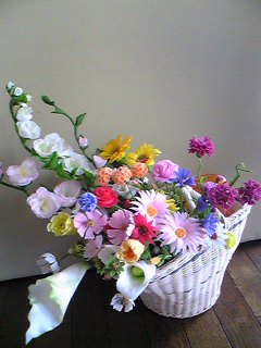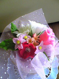 今回結婚された彼女ようにもう一つのお花を小さいブーケです器は彼女が使いたいからと持ち込みですそして私がこのレースを付けました以前結婚されたご夫婦にもブーケをプレゼントしましたお花の内容はトルコききょうなどなんですが私が勝手に造ったたぶん図鑑にないお花もありますお任せのご注文は勝手気ままなアレンジになりました喜んで下されば幸いです新婚さんの新居にこのブーケもおじゃま虫させて下さいねそして末永くお幸せに