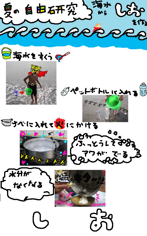 ぽーぽぽぽぽぽ ぽーぽぽぽぽ鼻フック菊次郎の研究所へようこそ 海サイコー なのか?そーなのか 刺身 うんめーマグロのから揚げ うんめー 夏限定での研究所である。 なぜ海は辛いのか調査依頼がきた 調べてみる 海水をなめる (ぺろん)うん。しょっぱにがい 正体を調べてやる 調査結果が出たようだ助手のタイガーマチクも手伝って順調に原因がわかった 上記の報告書を見てもらえばわかりるようにこれだ ハイハイ 以上、夏限定公開 鼻フック菊次郎研究所。