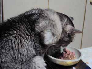 今日は昼間とても暖かかったのですが、夜になって強風が吹いて窓を震わせています。ベランダの猫ベッド(ドーム型)で寝ているモカ、ホ○ロンを入れて、出入り口はフリースと毛布をかけて風が入らないようにしています。さて、写真は「今日のグレース」です。食欲旺盛なのが救いです。↓右肩部分(白っぽい毛のところ)が腫瘍です。 細胞診のために毛を一部剃ってあります。なるべく柔らかくて高栄養のもの(ペースト状か高齢猫用のレトルト)に少しお湯を加えて食べさせています。↓マリン。↓こちらは、ミーちゃん。