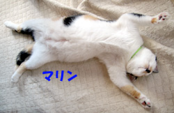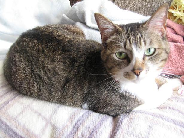 このごろ、とっても甘えん坊さんです。夜、寝るとき私のベッドに入ってきますよ。右腕はグレースで、左腕はミーちゃんです。そしてマリンとチビタンは足元。たまにメタボ・ショウ君も布団の中に入りたがりますよ。結構、競争率が高いのです。↓グレース、大きな腫瘍は右肩に出来ているので、この角度からはほとんど見えないと思います。食欲はとてもあるので、それだけが救いでもあります。