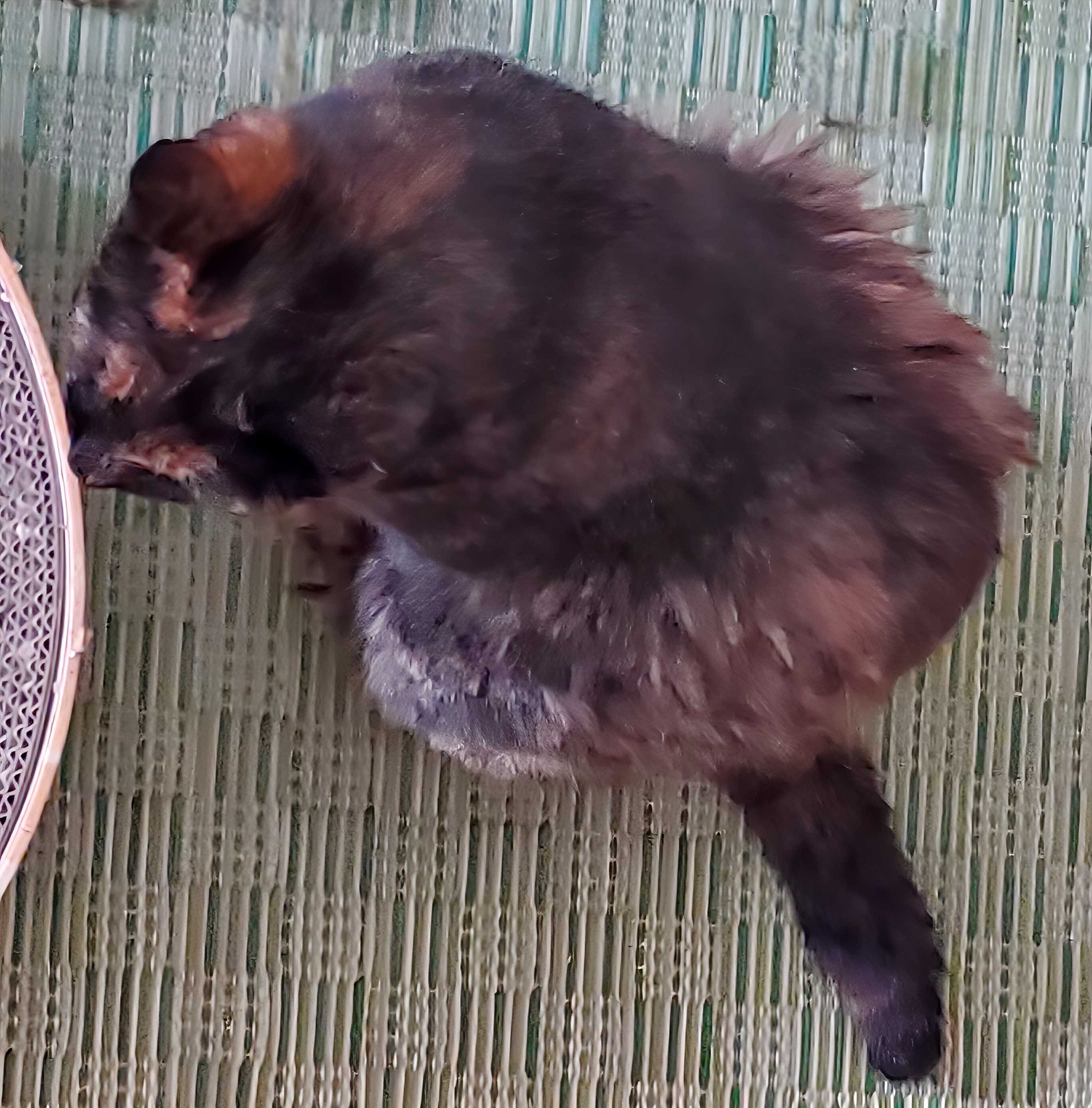 ムーさん、いつの間にかこんなに『毛玉』が‼️ブラッシングしたくても、私の顔を見ると逃げるし…😓体の左側は、ムーが吹き抜けに上がっている時に、指でツンツンってつまんで少しずつ取っていますが、怒って右側はなかなか取れないので、こんなにたくさん‼️首の下にも…。毛玉…まだ固まっていないみたいなので、バリカンでなくても、丁寧にほぐせば結構取れそうです…。ネットに入れてカラーもして、一度トライしてみようかな🎵一方、茶々丸チャーちゃんは、私が下に居ると、いつもご飯を期待して待っています🥰この後、待ち疲れて眠ってしまいました🎵可愛い食いしん坊さんです。