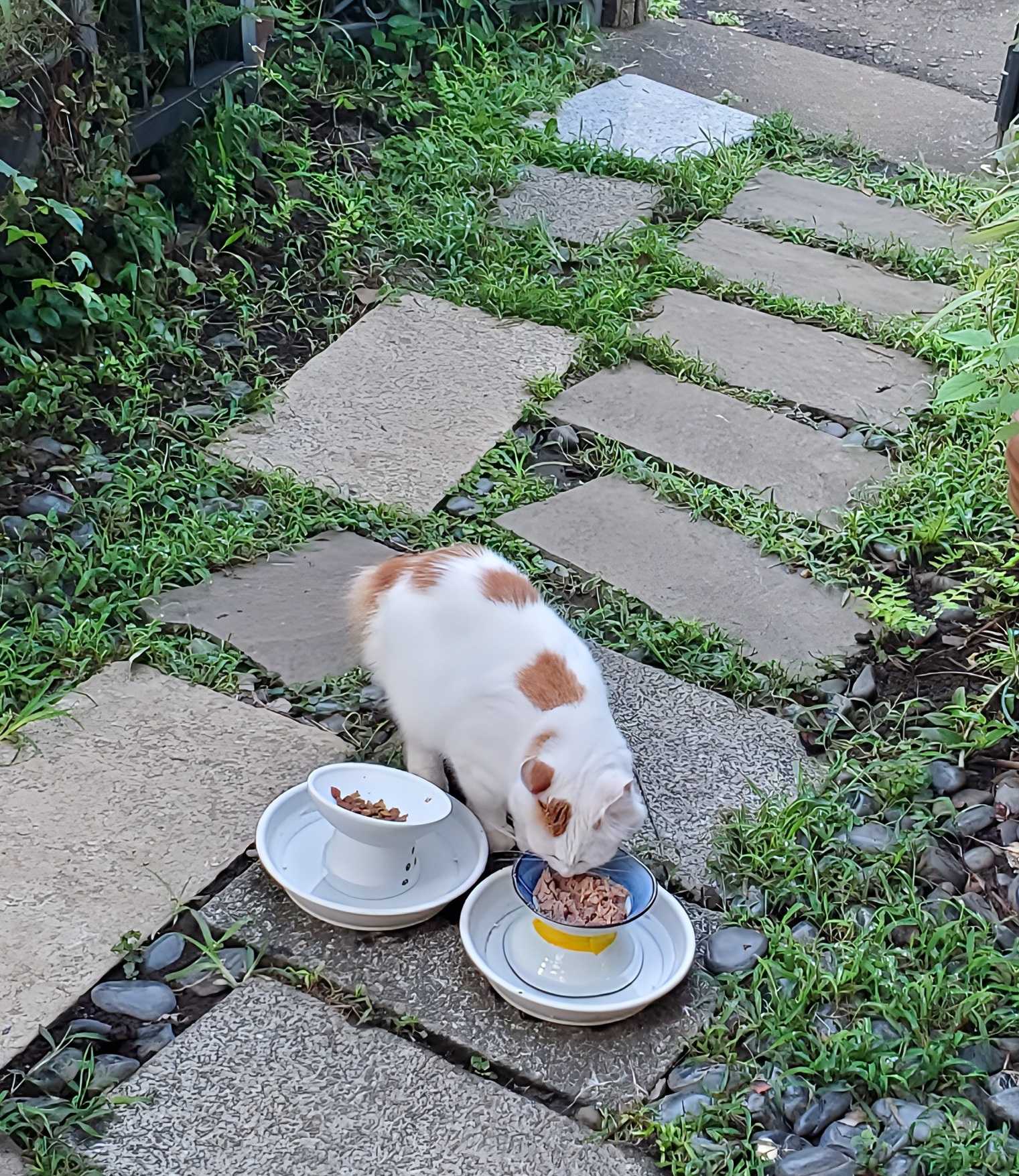今朝もシュガーちゃんがご飯を食べにきました🥰明け方に置いといたカリカリを食べ終わったところです😹早速、ピリュナワンのウエット(50g)をあげると、モリモリ食べ終わったので、今度はモンプチのパウチ(35g)。最近は、容量が少なくなって、実質上の値上げ😢我が家のようにたくさんいると、本当に面倒だし、空き袋ばかり増えて…💦こちらも『完食❗』とてもお腹が空いていたのね。また来てね🎵最近は、チロとシュガーちゃんが時々食べに来るので、一応庭の3ヶ所にカリカリとお水を常備しています。
