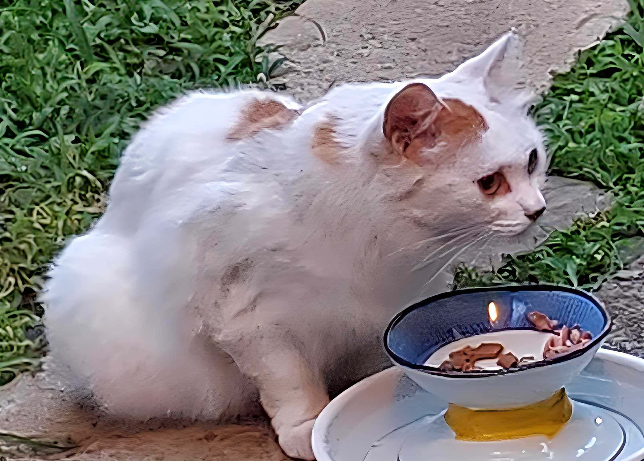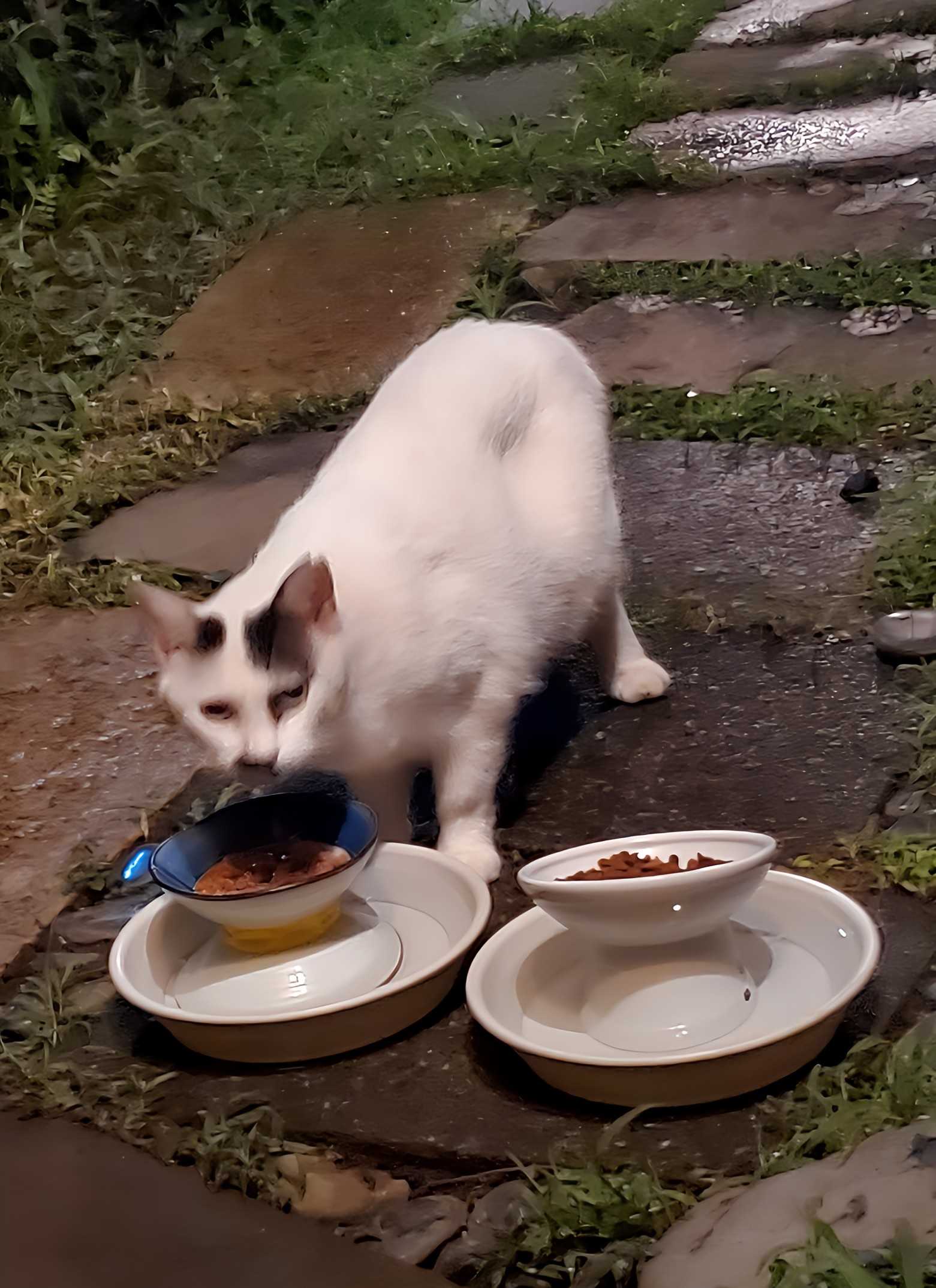 今朝、6時に起きたので玄関を覗くと‼️なーんと『シュガーちゃん』が昨夜置いておいたカリカリを食べに来ていました。元気な姿を見られて良かったです🎵さっそく、以前から家猫にしたいと言ってくださっている方に写真を送りました。しかも昨日の雷雨の翌朝なのに、毛並みがとても綺麗です。どこかでお世話して下さっている人がおられるのかも。あっ❗そうだわ‼️あまりにも突然の出来事だったので、ノミダニのお薬を仕込むのをすっかり忘れていました。残念💧お薬は次回、来てくれた時に🎵器に蟻んこやナメ◯ジなどが来ないように、鉢受け皿にお水を入れた中にカリカリ等を置いています。