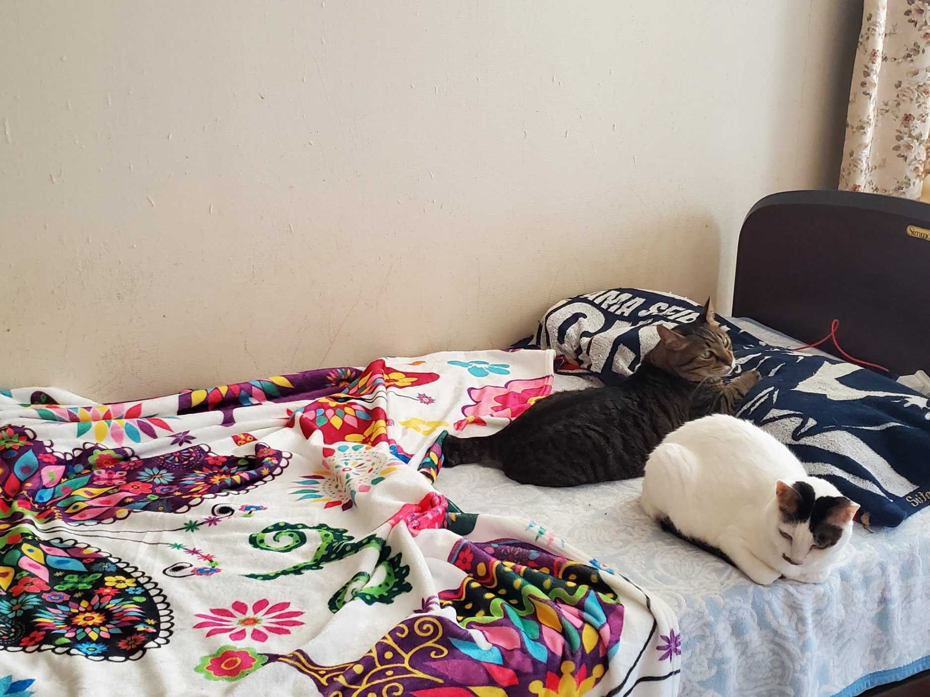 昨夜、幾度もお外に出て見ていたのですか、夜中の12時過ぎにやっと来てくれました‼️いつも少量のお水もかけて!ウェットは2種類とアンチノールと鰹節などをトッピングして上げています。そして、今朝は8時過ぎに、門の内側でちょこんと香箱座りしているチロ。早速、ご飯の支度🎵やはり定期的に顔出ししてくれると嬉しいです‼️写真は、先月。今月はまだ写真を撮っていませんので(汗)ご飯を食べて水分も摂ってくれれば、少し位の暑さにも堪えてくれるかな?と。まだノミダニの駆除薬が届かないので、もう少しの我慢よ🎶地域猫のシュガーちゃんを保護して家猫にしたいと言って下さっている近所の方と昨日お話する機会があったのですが、あちらにも顔出ししていないそうで…。我が家に定期的に来てくれるようになっていてら保護できたのですが…💦どこかお世話をして下さる方のお家にいるのかしら。写真のシュガーちゃんは、今年の5月。なかなか逢えなくて心配しています。長毛なので暑いでしょうね🥺さて私が家に入ると、またまた美優がチビを羽交い締めに…😓今まで、オス猫でさえマウントを取ることがなかったのに。その後、チビはベッドに。背中のコードは、私のスマホ用充電コードですにゃ。すると❗チビが大好きな…同い年のもも母さんが後ろからあつい💕視線を送っていました(笑)