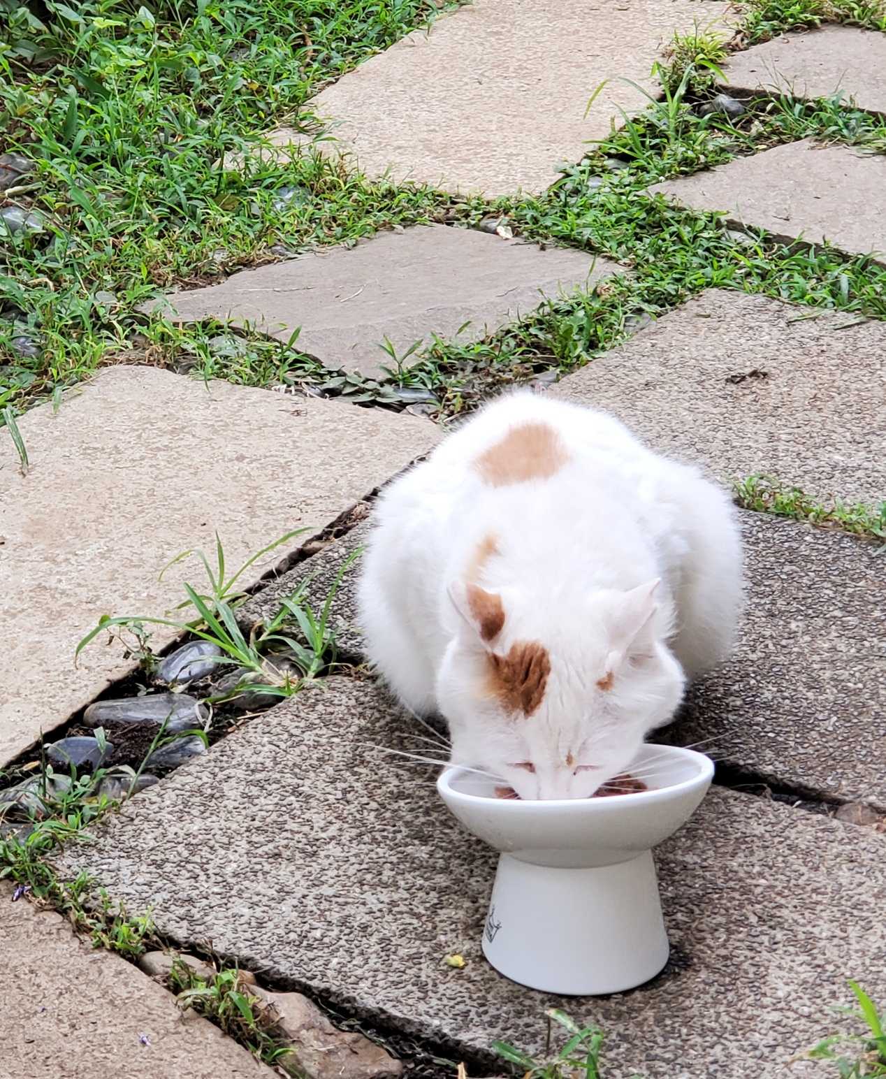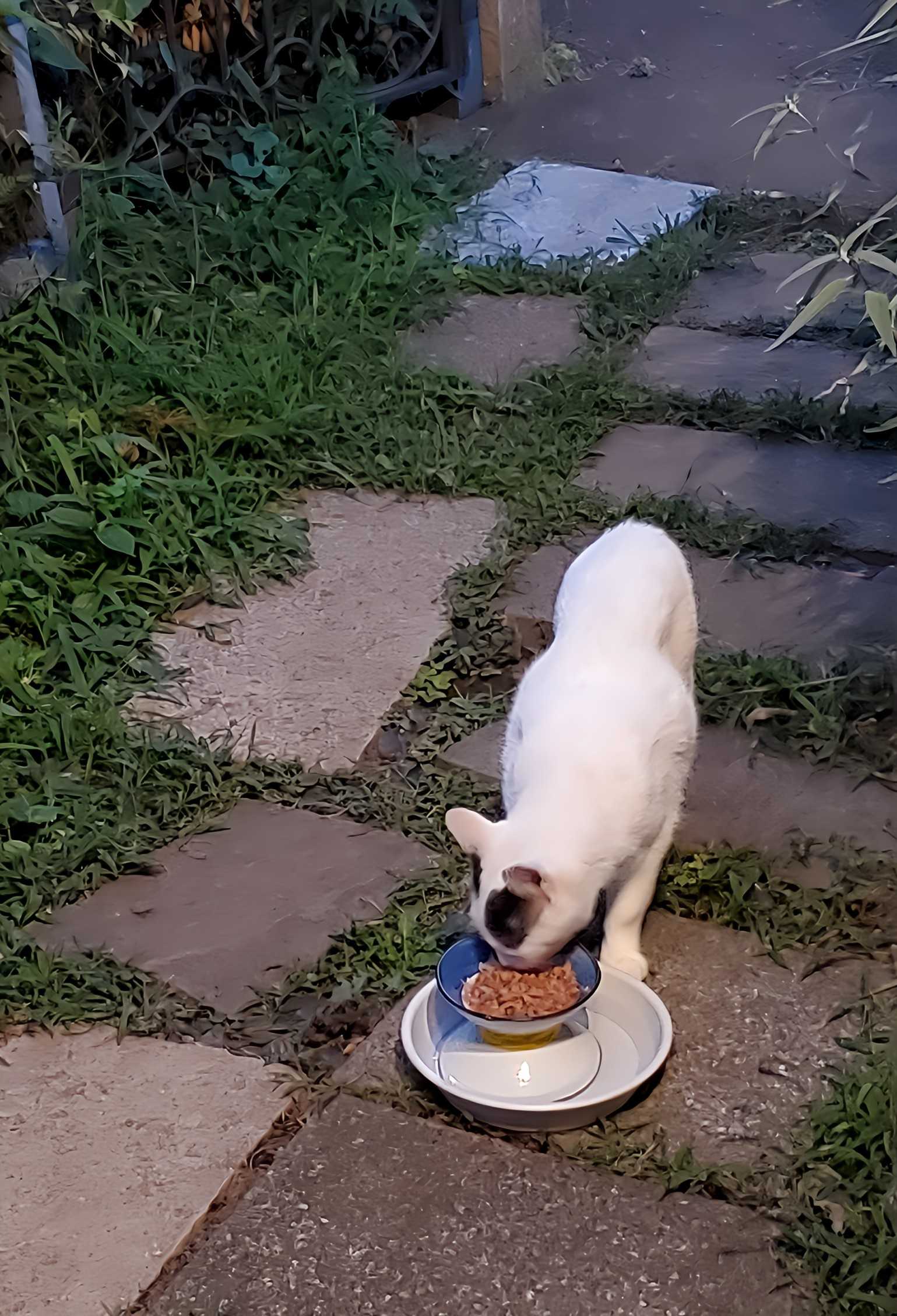 シュガーちゃんは早朝に続いて、夜の19時に再びご飯を食べに来ました。今回は、ちゃんとノミ・ダニのお薬を飲んで貰いました🎵夢中になって食べているかと思えば、後ろを気にして振り返ったり…💧先ずは、チロや宅配便の人にぶつからなくて良かったですにゃ❗